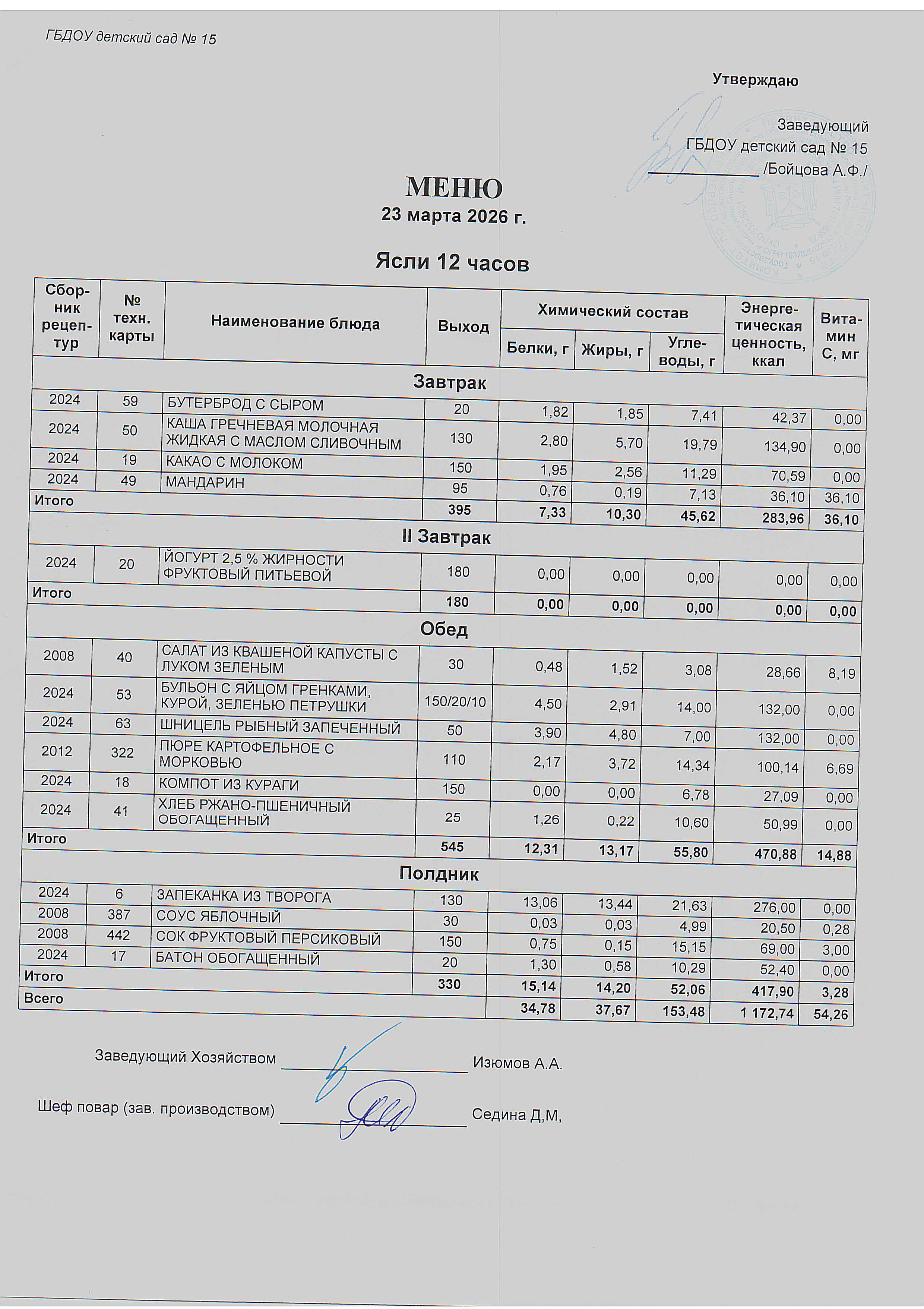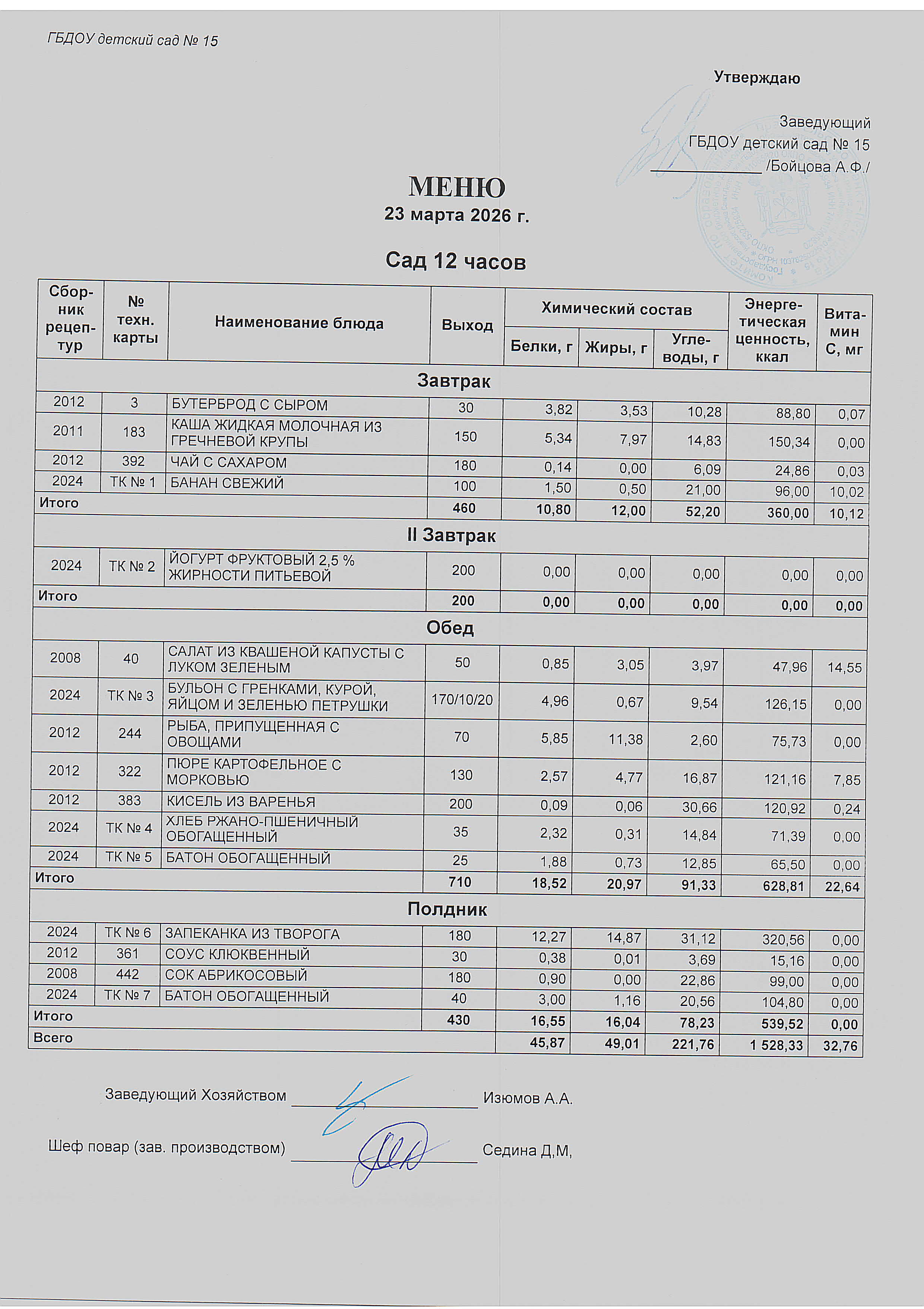 | Основное (организованное) меню (дифференцированное по сезонам и возрасту), которое размещается в виде сканкопии утвержденного документа по установленной законодательством форме |