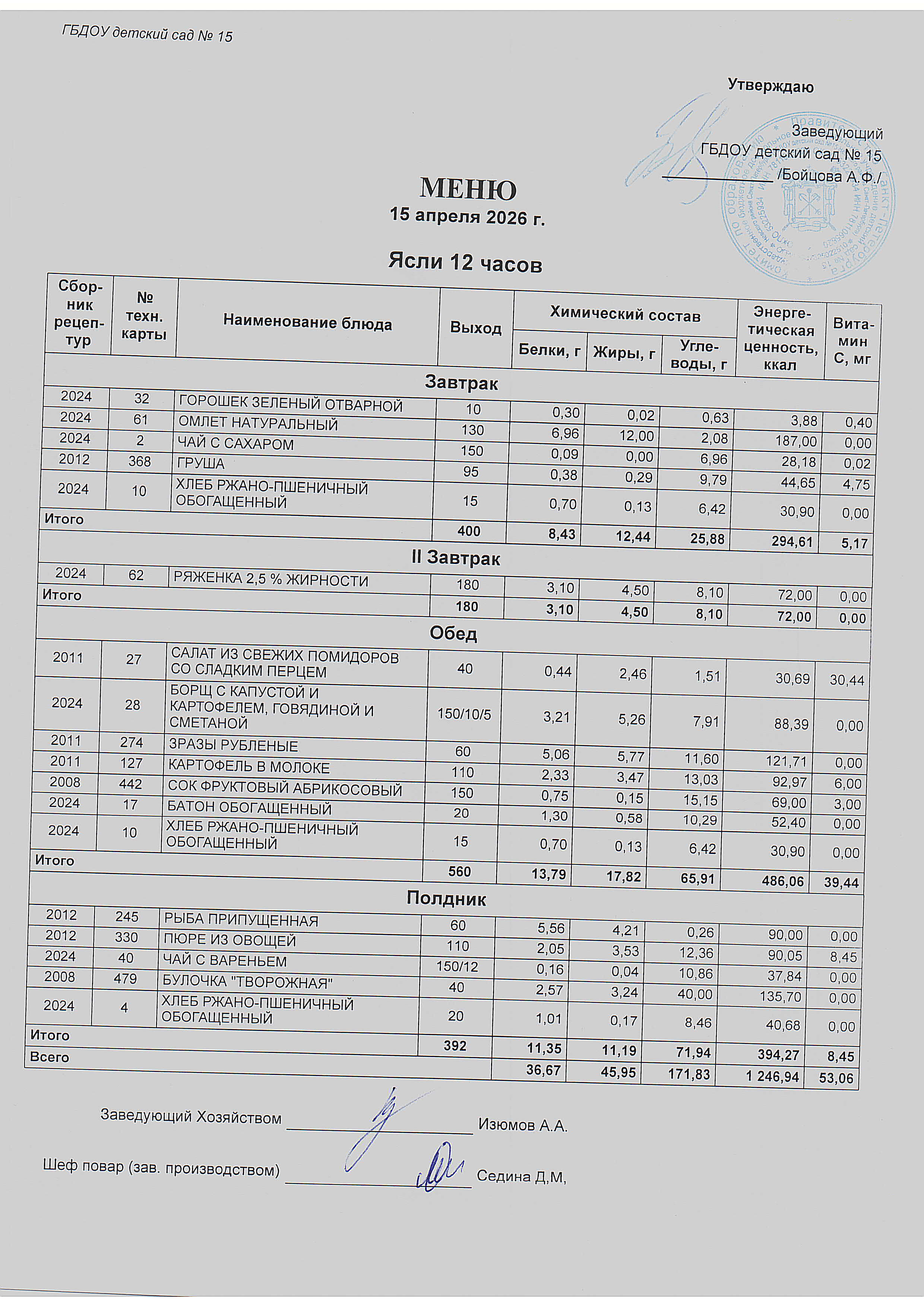 | Ежедневное меню основного (организованного) питания для всех возрастных групп (утверждённое руководителем ежедневно, с указанием наименования приема пищи, наименования блюда, массы порции, калорийности порции) |